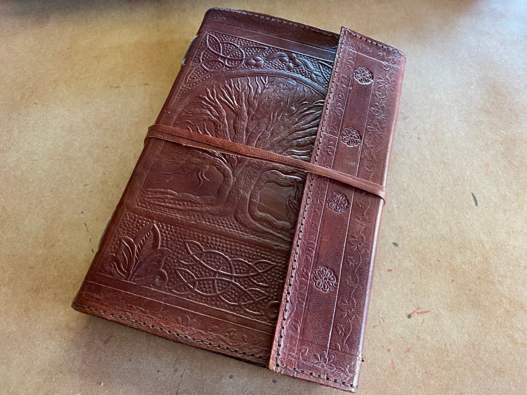 So, I have this beautiful leather journal that I bought several years ago with no idea what I would ever use it for. I’m setting it up kind of pseudo-bullet-journal style to organize resources and info about some of the Things I Need to Understand to Make a Magic System That Works for My Book (basically anything practical and craft-related).