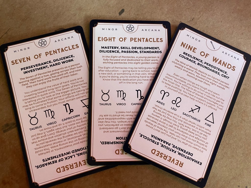 I pulled a general spread to forecast the week. It’s a little contradictory… beginnings and endings, heart and mind. I’m trying to work on interpreting them by intuition, without having to look everything up. So, I took some notes, and before I put them away I pulled out my Tarotorial deck to check my answers. I’ve shuffled this deck a few times, but having done much work with it. Before I started digging through to find the matches for my Everyday Tarot pull, I asked the Tarotorial deck to help me out. “Give me the cards I need to help me understand this spread.”
