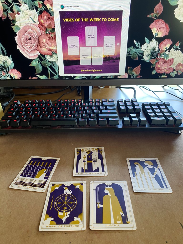The first card I drew (Vibes of the week) was the King of Pentacles. That’s a pretty straight forward message for success, confidence, fulfillment of a project. So, I have hope for my weekly goals.