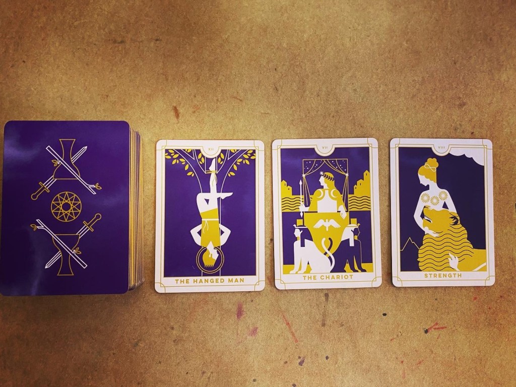 Today’s spread was the Hanged Man, the Chariot, and Strength. All big things, major arcana… both external and internal strength, looking at things from a new perspective.