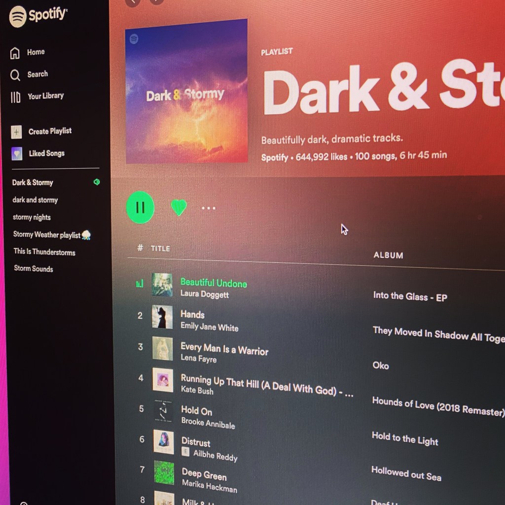 5) and 6) are actual storm sounds for when I want to write some moody stuff, but the sun is shining. This Is Thunderstorms by Spotify and Storm Sounds by Jaida Wellman. I’m not going to need these today, as the predicted cloud cover has already started dumping all over us. We had some pretty impressive thunder last night, and some of it is still rolling through. Perfect for the first 4 lists. Now to pick a starting song.