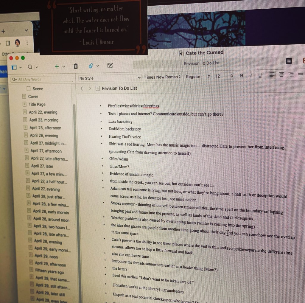 Finishing out the week making notes about what to change in the next draft. I’m trying not to make any big revisions until I get all of my feedback in, but every time a comment comes in from a beta, I’m all up in that Scrivener doc again. Next time I might have to unlink my author email from my regular account so I don’t see it until I’m ready.