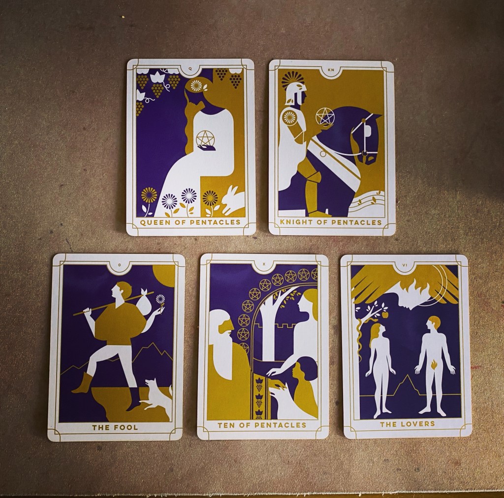 The lesson is the Queen of Pentacles, that working mother card, balancing care and practicality. A reminder to be generous and nurturing, while also getting shit done.