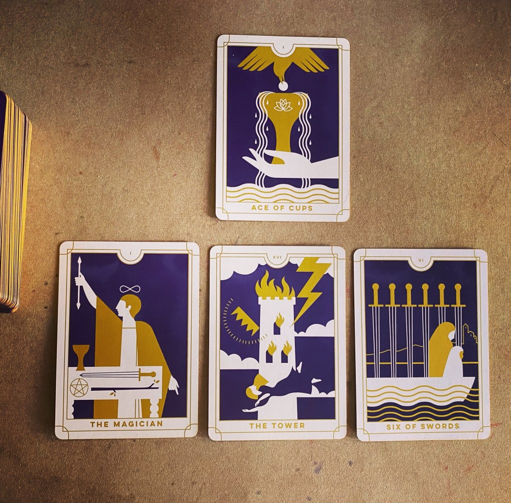 At first glance, this spread is a little scary. The Tower is a sign of destruction, and the six of swords is about releasing baggage, rites of passage, and transitions.