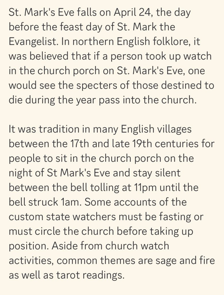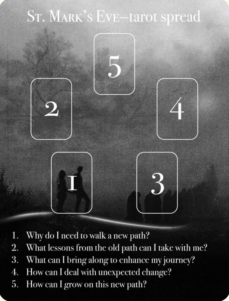 So, in honor of St. Mark’s Eve, even though I won’t be sitting in a churchyard tonight, today I pulled a spread from #stiefvaterland.