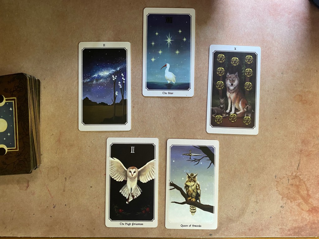 First, I pulled a spread from my Anima Mundi deck, by Megan Wyreweden, because it’s pretty. Then I pulled the spread from The Raven’s Prophecy deck, by Maggie Stiefvater, because obviously.