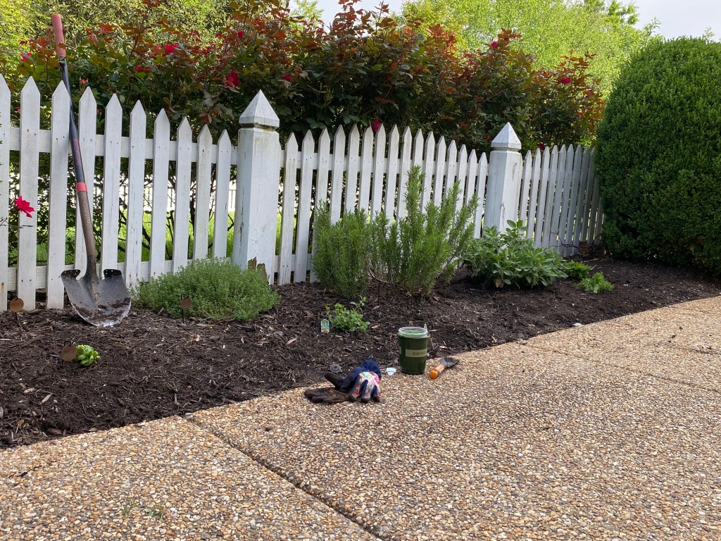 Today I added a new basil plant, since we used it a lot last year, and it didn’t come back (maybe it’s not supposed to?), and a new oregano, since the kiddo’s seeds didn’t take last year.